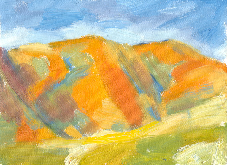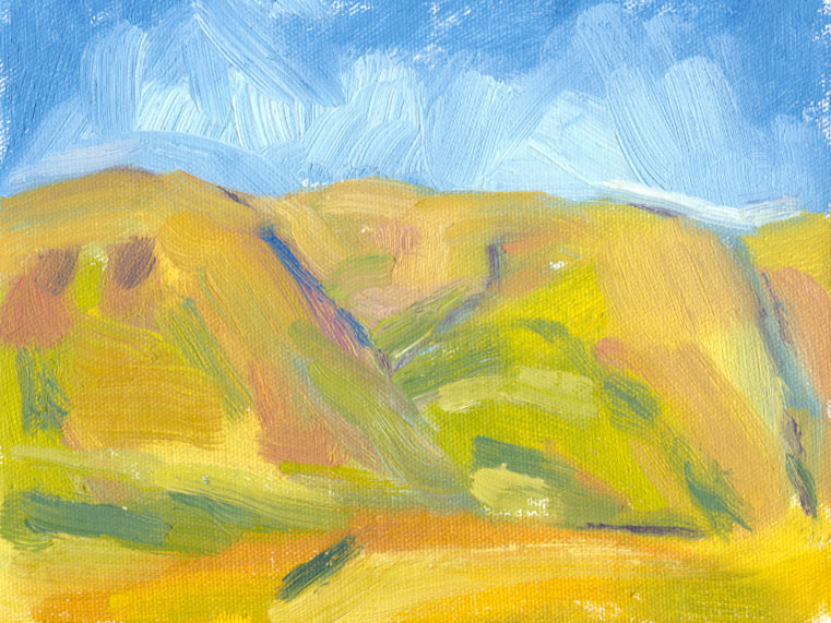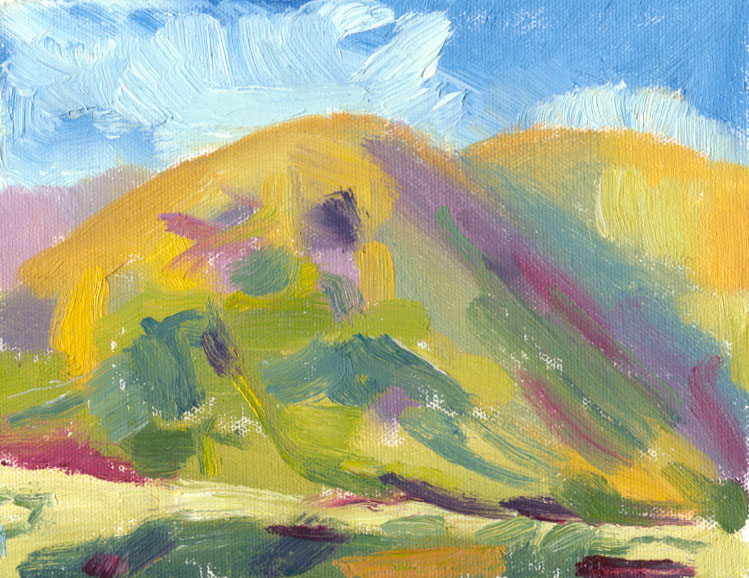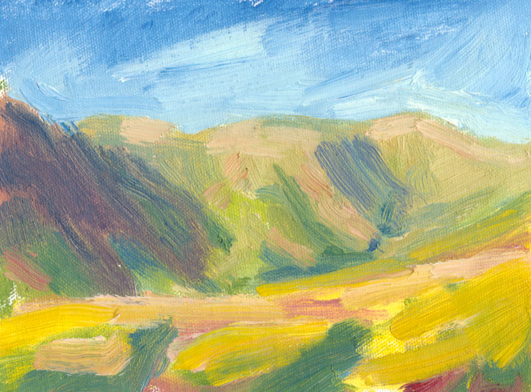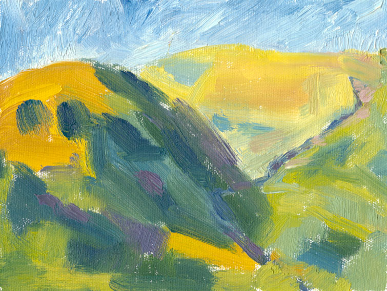 I spent a few weeks last summer trying to paint the shadows in the valley. The shadows in the contours of the hills are hundreds of feet high – vast, lumbering areas of darkness that stealthily creep around as I watch. Inside the shadows are many areas of colour, making it very difficult to translate them into paint. The more I stare and try to simplify them so that they fit onto my tiny canvas, the more impossible the task seems to be.
