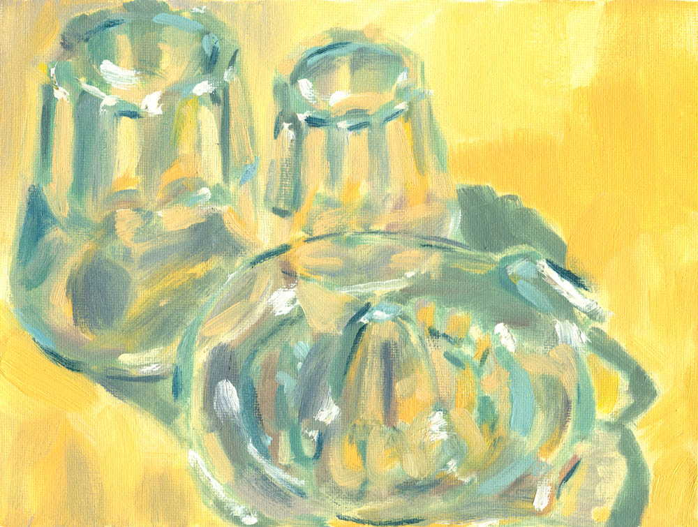 One of my Christopher Lehmpfuhl catalogues is full of intimate still lifes: views through windows and portraits of tables loaded with glasses, crockery and other small items. It gave me an idea to have a go at capturing a ‘family’ of glassware grouped on a table top.