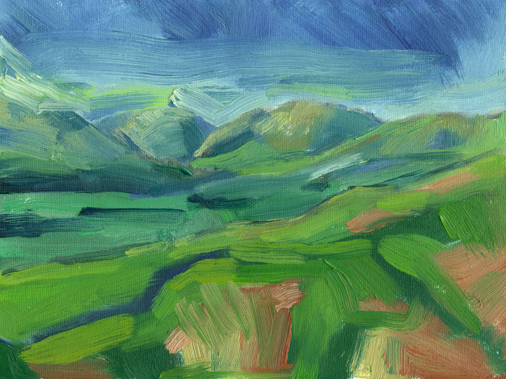 Tebay fells in sun, oil on canvas, 6″x8″