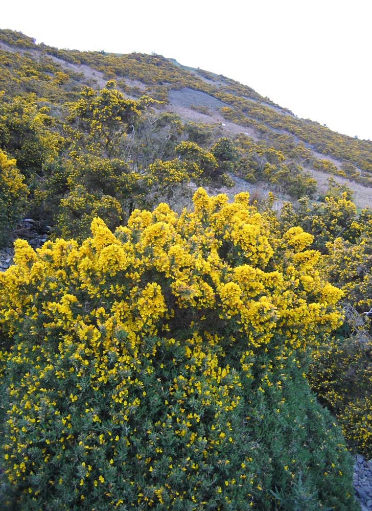 In the evenings the light can be magical, with huge areas of shadow and soft golden shapes rising out of the darkness. The sky has more colours – violets and pinks as well as blue – and the hills can be anything from ochre to viridian or even burnt orange. It’s the best time to wander on the hill. All of the colours glow, especially the gorse flowers which are, oddly, always in bloom. No-one else tends to be around because the lure of the television screen is stronger than the power of nature at this hour, or so it seems.